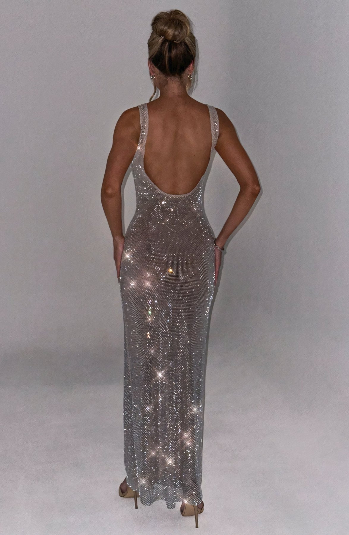 Shine brighter than the night sky in the Selene Starlight Maxi Dress. Designed with a sleek silhouette and drenched in dazzling silver embellishments, this gown captures every flicker of light with breathtaking radiance. The body-hugging fit and elegant square neckline create a flawless shape that exudes confidence and glamour. Perfect for evening soirées, red-carpet moments, or any occasion where all eyes should be on you. ✨